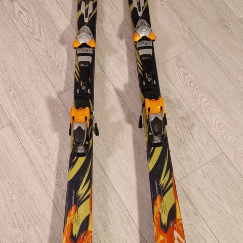 Freez7 twintipski på 135 cm med integrerte bindinger. Skiene har oransje og svart design. Bindingene er justerbare for ulike skostørrelser. Passer til alpint bruk i preparerte bakker. Såler og kanter vises på bildene for vurdering av stand.