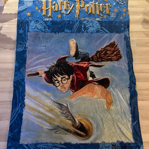 Tilsynelatende hjemmelaget quilt. Vattert og mykt. Trolig reparert i søm to steder, se siste bilder. Nydelig bomullsstoff med bilder av dyr: flodhest, løve, pinvin og sjiraff. Klare farger. Flott som barneteppe /babyteppe.