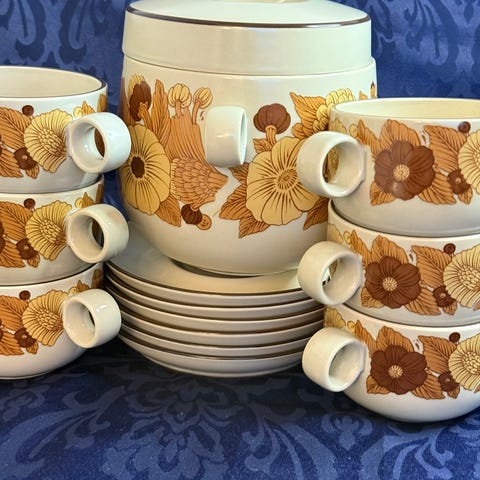 Selger pent/ubetydelig brukt servise "Blumen" av designer H.T.Baumann. Form: Berlin. Settet består av 12 par kopper med under-fat og asjett. Asjettene måler 19,5 cm i dia., og koppene passer som kaffe-/te- eller sjokoladekopper da de er forholdsvis store. Settet er produsert i tynn, fin kvalitet og samtlige deler er i perfekt stand. Studio-line er det beste fra Rosenthal, og det er kjøpt hos daværende Bergens Glassmagasin. Selges komplatt for kr 4800,- (kr 400,- pr kuvert).