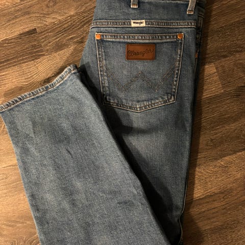 Buksa er laget i bomull og har modellen «Retro Flare», med utsvingte ben. Størrelse er W27 og lengde 32. Klassisk femlommers design med baklommer med Wrangler-søm og skinnpatch med logo bak. Lukkes med glidelås og knapp i livet.