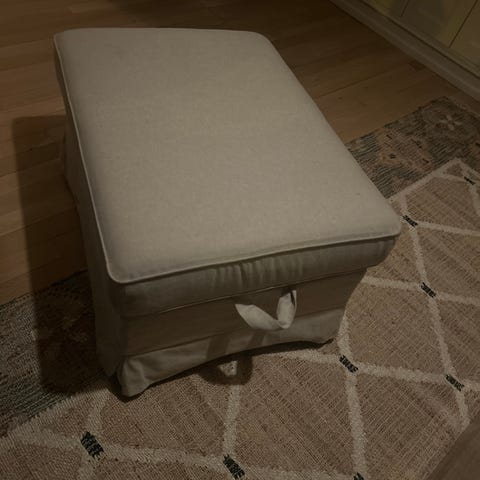 Ektorp puff med to trekk selges. Trekk i rødt og hvitt følger med. Romslig oppbevaring. Trekk kan vaskes i maskinen.