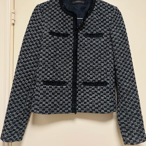Elegant og strukturert jakke fra Zara Studio i klassisk sort tweed med subtile glitrende fibre som gir et eksklusivt uttrykk. Jakken har dekorative knapper, rå kanter og fine detaljer som gir karakter og en sofistikert, Paris-inspirert stil.