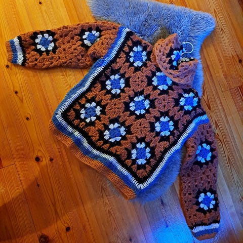 Genser, heklet. Lengde 55 cm, bredde 55 cm, ermelengde 47 cm.