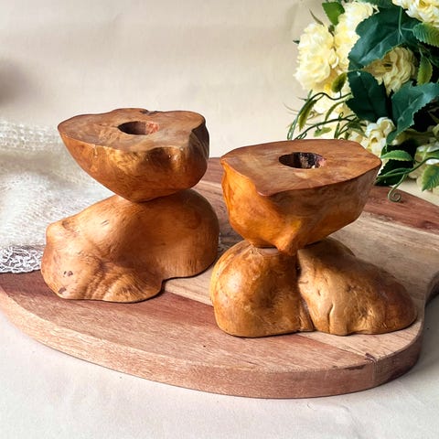 Jeg selger to stemningsfulle, håndlagde lysestaker i naturlig tre med vakre årringer og levende struktur.