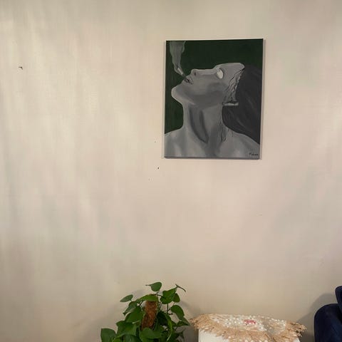 Maleri med portrettmotiv av en person med blomster plassert over hodet. Fargepaletten består hovedsakelig av røde, rosa og mørke toner. Bildet er rektangulært og egner seg som veggdekor i stue, gang eller andre oppholdsrom. Kunstner og nøyaktige mål er ikke oppgitt.