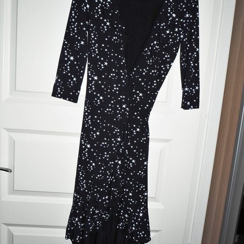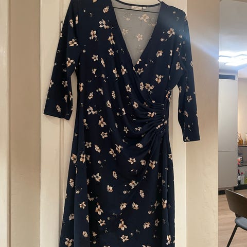 Ellos hverdagskjole for dame i størrelse 48. Kjolen er blå og laget i polyester. Modellen har knytebelte i livet og mønster over hele stoffet. Passer som hverdagskjole eller til enkle anledninger.