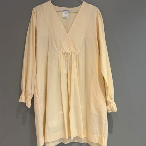 Pieces topp for dame i størrelse L. Toppen er gul og laget av bomull. Modellen har korte ermer med volangdetaljer og knappelukking foran. Passer til hverdagsbruk eller som en lett sommertopp.