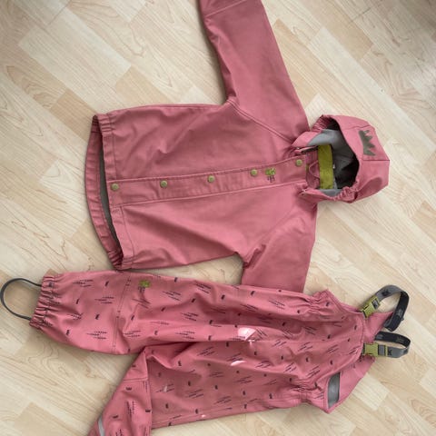Kattnakken regntøysett i størrelse 110. Sett i gul farge, laget i polyester. Består av regnjakke og selebukse. Det ene buksebeinet mangler en fotstrikk. Mulig baken ikke tåler mye vann over lengre tid. Ikke vasket, for å unngå slitasje.