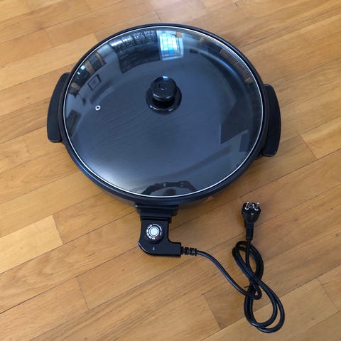 Rund elektrisk stekepanne med slippbelegg og avtagbar termostat/strømkabel. Pannen har gjennomsiktig glasslokk med håndtak. Diameteren er rundt 35 cm (se målebånd på bilde). Egner seg til steking og varmeholding av ulike typer mat ved bordet eller på kjøkkenbenken. Pannen kobles til vanlig stikkontakt.