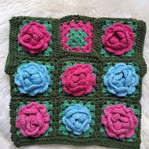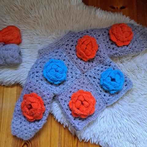 Barnevest, heklet med firkantede motiver. Mål: bredde 35 cm, høyde 36 cm
