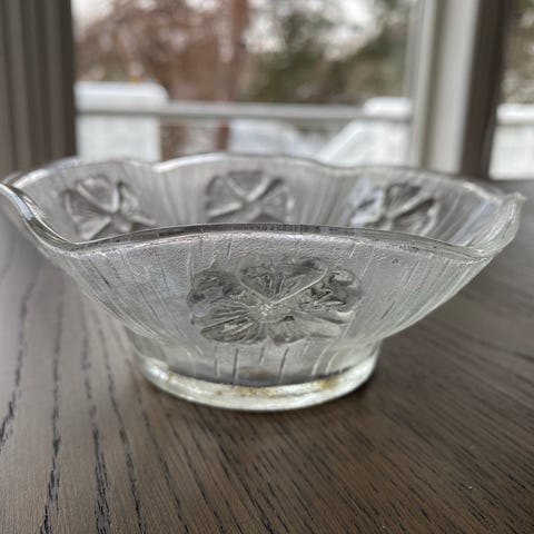 Grønn skål/bolle med bølget form og dekorativt blomsterrelieff langs nedre kant.