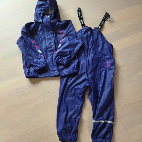 Fint sett fra Wheat med jakke og bukse. Bukse er hel og fin, men har noen skyggeflekker som jeg ikke har forsøkt å fjerne. Jakke er også hel og fin, men den ene logoen har litt slitasje- se bilde. Vi har kjøpt det brukt selv, men har såvidt jeg husker har vi bare brukt jakken, og kun til pent. Vanntett og anvendelig sett.