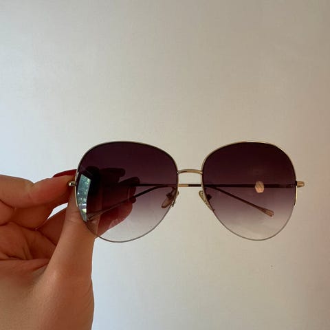 Solbrille med rosa glass. Perfekt som en tidlig sommergave til deg selv, eller en du er glad i. Morsom og stilig brille, som garantert vil gi oppmerksomhet, og fornøyde smil. Bredde mellom stengene: 14 cm. Nypris: 1700,-