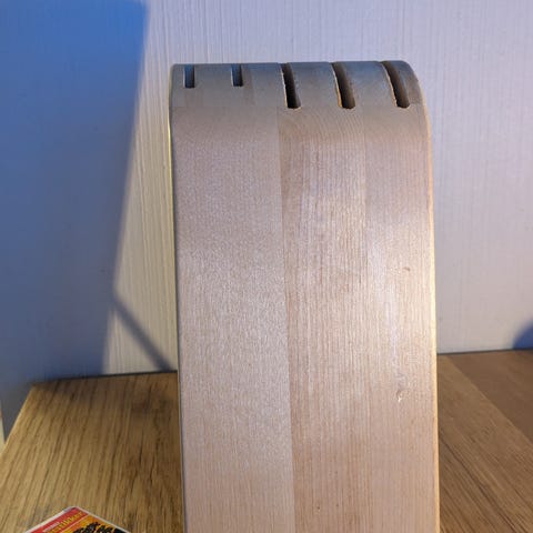 Fiskars knivblokk i tre. Blokken har flere spor til oppbevaring av kjøkkenkniver i ulike størrelser. Den står skrått ved hjelp av et metallstativ på baksiden, noe som gir enkel tilgang til knivene på kjøkkenbenken. Egnet for organisert og sikker oppbevaring av kniver i hjemmekjøkken.