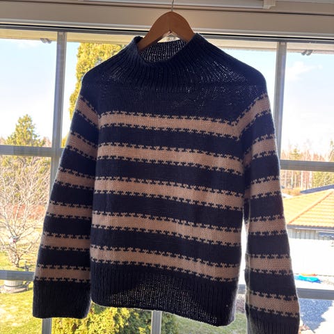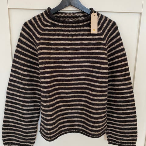Lyon Sweater fra PetitKnit strikket i Sunday og Tynn silkmohair fra Sandnes garn. Bunnfarge sort i dobbel tråd Sunday, striper i beige med enkel tråd Sunday sammen med Tynn silkmohair.