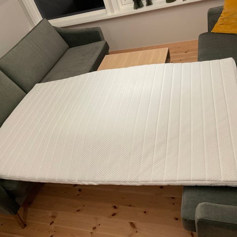 Overmadrass og madrass beskytter er kjøpt hos Ikea 23.01.26. Overmadrassen er derfor inkl. Madrassbeskytter og evnt ett uåpnet og ubrukt laken kan også følge med dersom ønskelig.