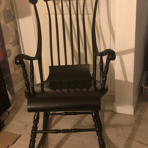Svart gyngestol, har berre stått til pynt. Laga med "slitt finish"