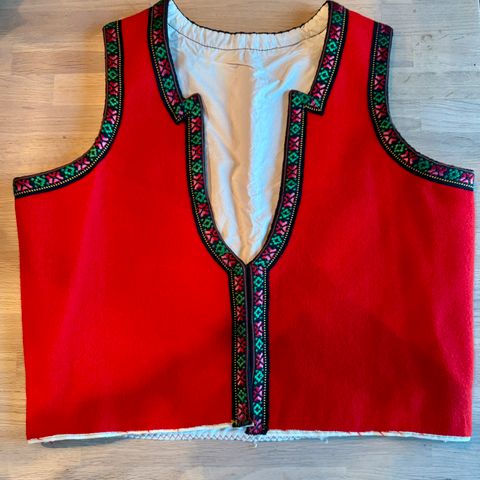 Hardanger bunad vest ull rød dame vest i ull for dame i størrelse XS/S. Vest i ensfarget rødt stoff med dekorative bånd langs kanter og skuldre i grønt, svar som nytt