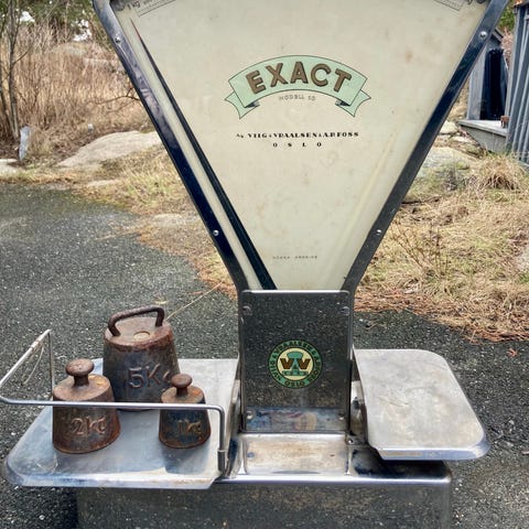 Gammel skålvekt selges. Ulovlig ved kjøp og salg inngravert.