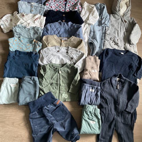 barneklær for gutt i størrelse 68, i flere farger. Pakken inneholder ulike plagg som bukser, bodyer, heldresser, selebukser og yttertøy, egnet for baby. Klærne har varierende farger og mønstre, og passer til bruk både inne og ute i hverdagen.