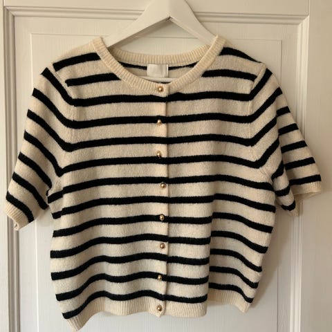 Stripet cardigan strikket i dobbel tråd Filcolana Arwetta. Bunnfarge «marsipan» striper i sort. Mønster fra Coco Amour knitwear.
