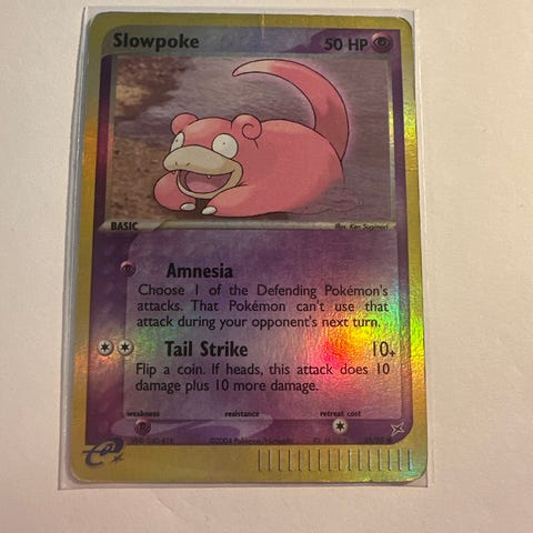 Pokémon Slowbro samlekort med holografisk overflate. Kortet viser Pokémon-figuren Slowbro med angrepene Full-Belly Refresh og Startling Trip. Standard Pokémon-bakside med Pokéball-design. Egnet for samling eller bruk i Pokémon Trading Card Game.
