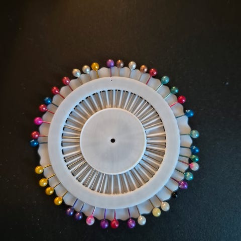Nålepute laget av en porselens kopp og en håndbrodert duk.
