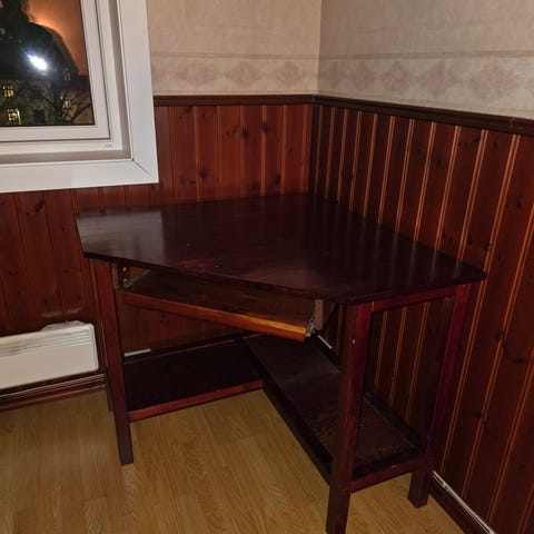 dette eldre skrivebordet i heltre og finér har tjent meg godt, men nå har jeg ikke plass til det lenger.