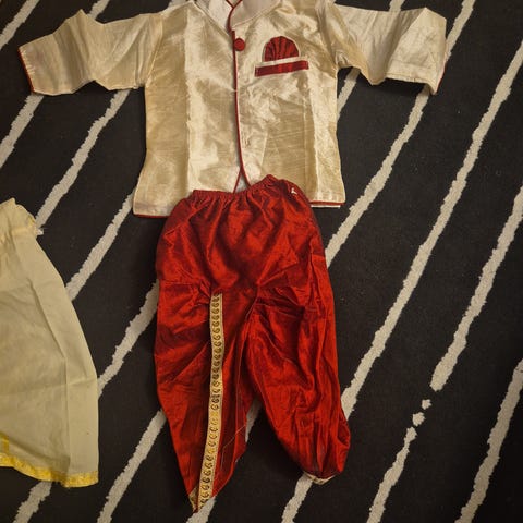 Pakke med diverse klær og utstyr. Inneholder blant annet flere langermede overdeler i ulike gråtoner, et par svarte joggesko med Batman-motiv til barn, en lys jakke eller skjortejakke med knapper og brystlommer, samt en hvit babybadestøtte med motiv.