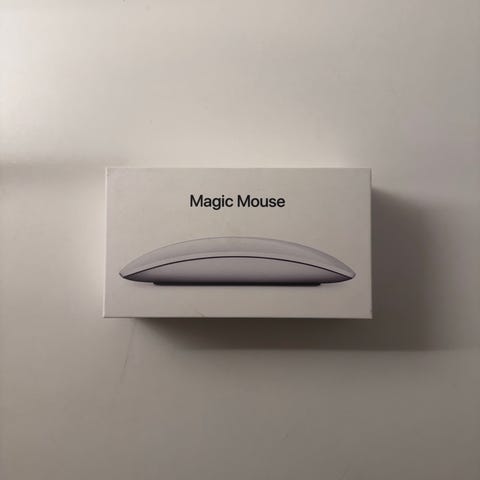 Apple Magic Mouse datamus i hvit farge. Trådløs, oppladbar mus som kobles til Mac via Bluetooth. Lades med USB‑C til Lightning-kabel (krever kompatibel kabel og Mac med nyeste versjon av macOS). Musen har berøringsflate på toppen for rulling og gester, og en glatt underside med to glideskinner. Egnet som tilleggsutstyr til stasjonær eller bærbar Mac som støtter Magic Mouse.