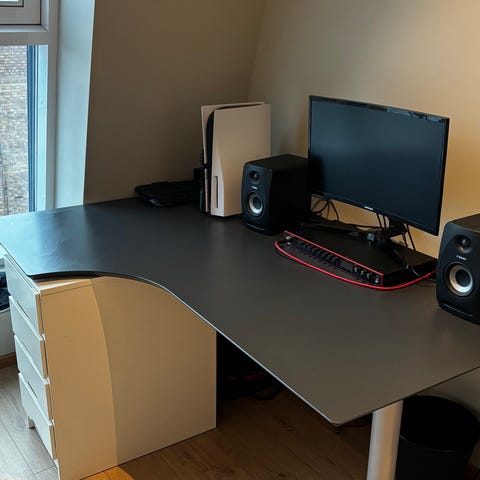 Stort og solid skrivebord / kontorpult/ skrivepult, perfekt til hjemmekontor. Eikeplate heltre og hvite ben. God plass til både skjerm og skrivesaker. Passer fint i et hjørne.