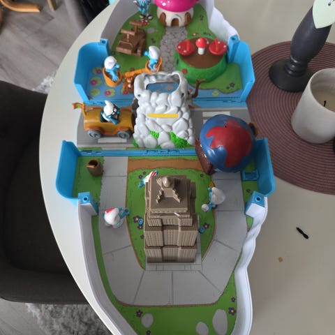 Blandet med småfigurer av Smurfene. Bildene viser flere forskjellige smurfer i ulike positurer og med ulikt tilbehør. Figurene er i hard plast og er i liten størrelse som passer til lek eller som samlerobjekter. 26 stk og utvalg fremgår av bildene.