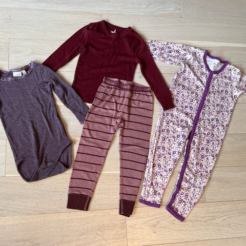 Flotte ullplagg som kun er brukt få ganger da datteren vår vokste ut av størrelsen i rekordfart. Hun fikk ullklærne til jul 2025, men allerede to uker inn i det nye året måtte vi opp en størrelse. Janus ullbody er lagt til senere uten ekstra kostnad, men den er eldre enn desember 2025.