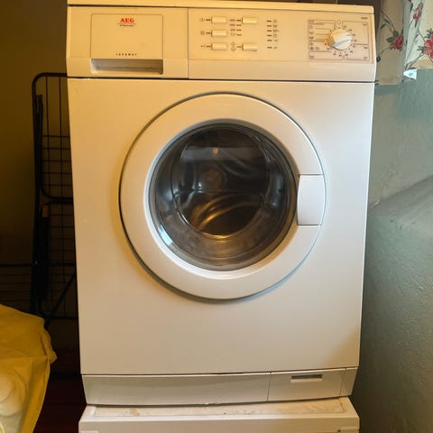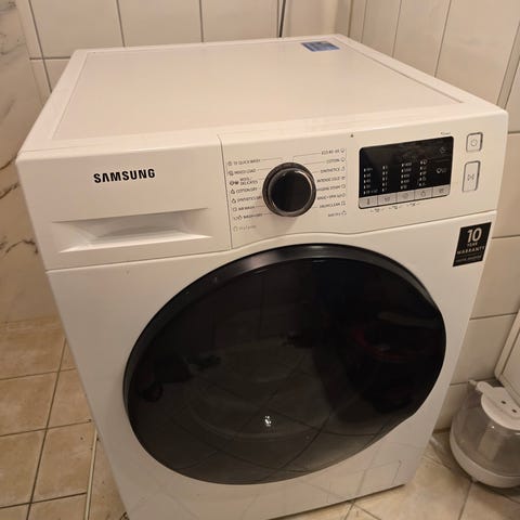 Samsung frontmatet vaskemaskin i hvit utførelse. Maskinen har frontåpning med rund dør og digitalt display med programvelger på fronten. Egnet for innbygging under benk eller frittstående plassering. Passer til vanlig husholdningsbruk for vask av klær og tekstiler.