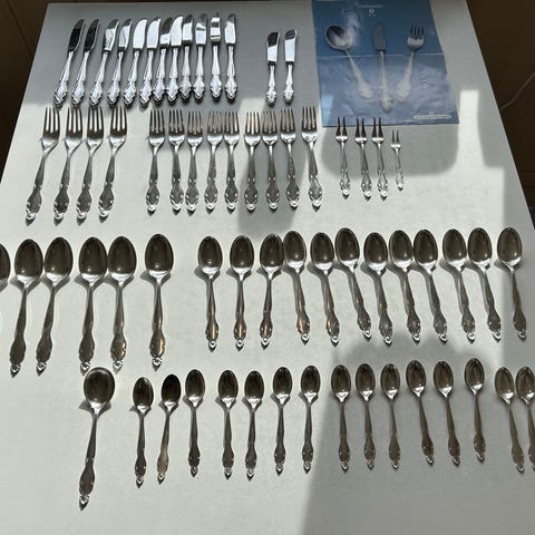 Farmand bestikksett i sølvplett 12 personer selges billig! Nypris ville vært over 24.700 NOK hos TH Magnussen. Settet består av spisegaffel (ca. 19,5 cm), spisekniv (ca. 22,5 cm), spiseskje (ca. 19,6 cm) og teskje (OBS: kun 2 stk teskje). Bestikket har klassisk mønstret skaft og er egnet til daglig bruk og servering.