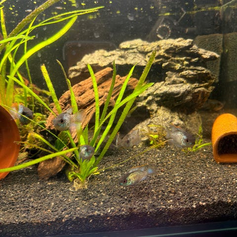 Rydder opp i akvariumer og har noen fisker til salgs.