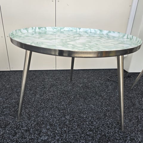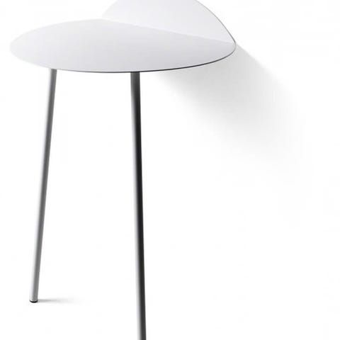 Lekkert sidebord i stål - hvit lakkert. Enkel montering. Passer som nattbord, sidebord , el. Bordet har en liten avskalling på overfalte på 0,3cm, som lett lar seg fikse.