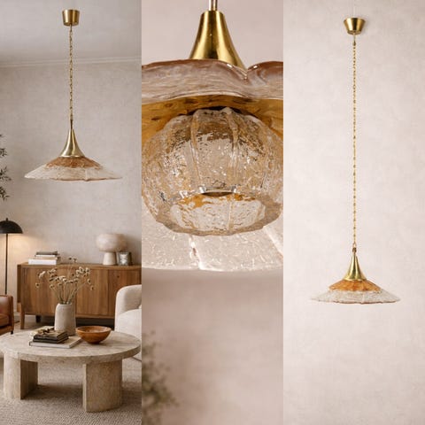 Eksklusiv og sjelden taklampe i glass og messing, tilskrevet Hans-Agne Jakobsson for Orrefors, produsert i Sverige på 1960-tallet.
