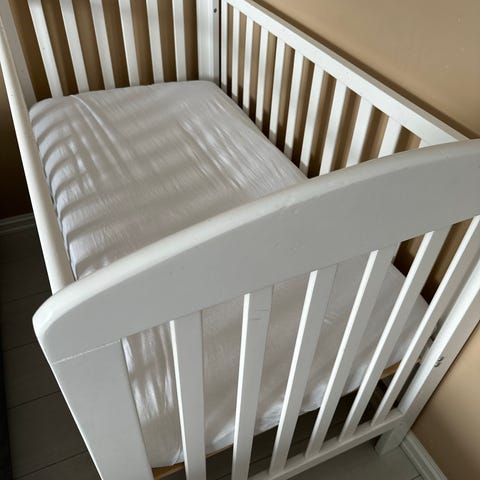 Sengen står på ben med hjul, noe som gjør den enkel å flytte ved behov.