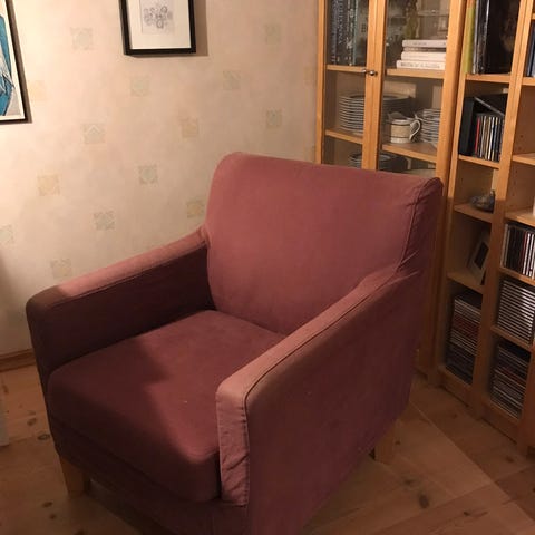 Retro stol gis bort mot henting. Oliven grønn velur stoff. Tre ramme malt i fargen dempet sort. Pent brukt. Ingen flekk eller feil.
