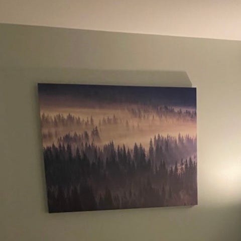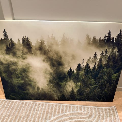 Fantastisk nydelig bilde av rolig skog i tåke. "Misty forest". Må kjøpes oppheng til. Usikker på om dette er glass eller akryl, men tror dette er glass.