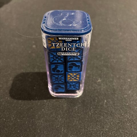 Warhammer 40,000 Thousand Sons Dice terningsett i blå farge med gule detaljer. Terningene leveres i en gjennomsiktig plastboks med blått lokk. Settet er laget for bruk til Warhammer 40,000 og lignende terningspill, og har Thousand Sons-tema med tilpassede symboler på enkelte sider.