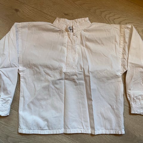 Penskjorte til festdrakt. Pene broderte detaljer på krage, foran på brystet og nederst på ermene. Trykknapper på brystet og pene dekorative mansjettknapper.
