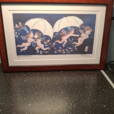 Innrammet kunsttrykk med motiv av engler som flyr med paraplyer over en mørk blå bakgrunn. Bildet er montert med lys passepartout og enkel, mørk ramme. Passer som veggdekor i stue, soverom eller barnerom. Størrelse og teknikk er ikke oppgitt nærmere av selger.