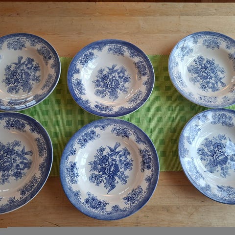 2 stk dype desserttallerner- Ø= 19 cm FEILFRI forside; BAKSIDE kun lett slitt glasur der tallerkenen har skavet mot underlaget i årevis. Ingen krakkeleringer, nagg, misfarginger eller sprekker.