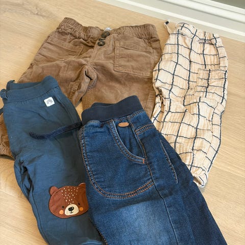 barneklær for gutt i størrelse 74. Pakken består av blant annet bodyer, bukser, buksedress og gensere.