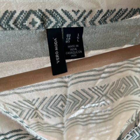 Småblomstrete mønster i lilla, grønn, hvit og okergul. Kappe nederst på kjolen