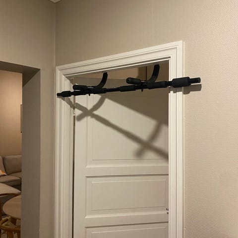Dørstang pull up-stativ i svart metall med polstrede håndtak. Monteres i døråpning uten fast skruing og kan tas ned etter bruk. Egnet til øvelser som pull ups, chin ups og hengende mageøvelser. Passer for innendørs bruk i standard dørkarmer, og kan bidra til variert overkroppstrening hjemme.