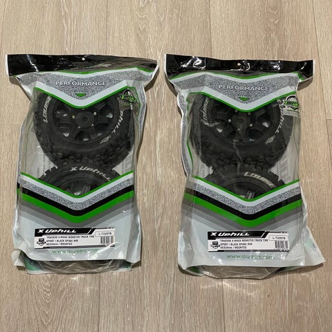 Pent og lite brukt hjulsett til RC-bil bestående av 4 komplette hjul selges. Hjulene har knottemønster i gummi som egner seg for bruk på variert underlag. Felgene er svarte med fler-eike design. Passer til Traxxas XRT og X-Maxx.