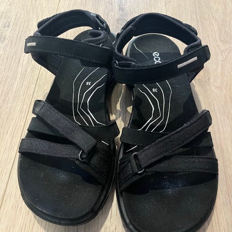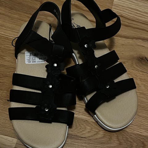 Skechers sandaler i størrelse 41. Modellen har flere kryssende remmer over foten og justerbar rem med borrelås rundt ankelen. Fargen fremstår som svart. Sålen er profilert for godt grep og har dempet fotseng for økt komfort. Passer som hverdagssandaler eller til lett fritidsbruk i varmt vær.